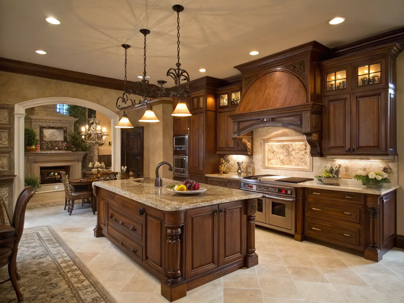 A warm, traditional kitchen with custom wood cabinets, classic hardware, and warm-toned countertops, emphasizing timeless appeal and craftsmanship.
